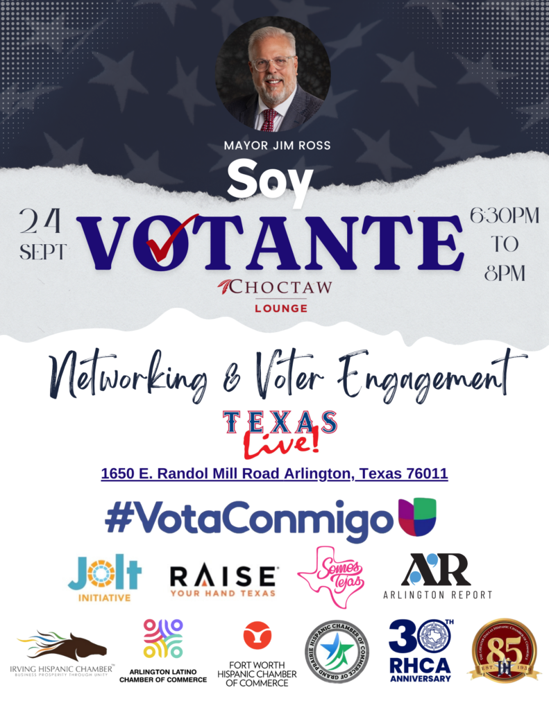 In a collaborative effort to empower and mobilize the Hispanic community, Hispanic Chambers of Commerce in North Texas are joining forces to host the “Soy Votante” voter engagement event. This free event will take place on September 24th from 6:30 PM to 8:00 PM at the Choctaw Lounge in Texas Live, and is organized by the Fort Worth Hispanic Chamber of Commerce, Irving Hispanic Chamber of Commerce, Hispanic Chamber of Commerce in Grand Prairie, Greater Dallas Hispanic Chamber of Commerce, Arlington Latino Chamber of Commerce, and the Regional Hispanic Contractors Association.